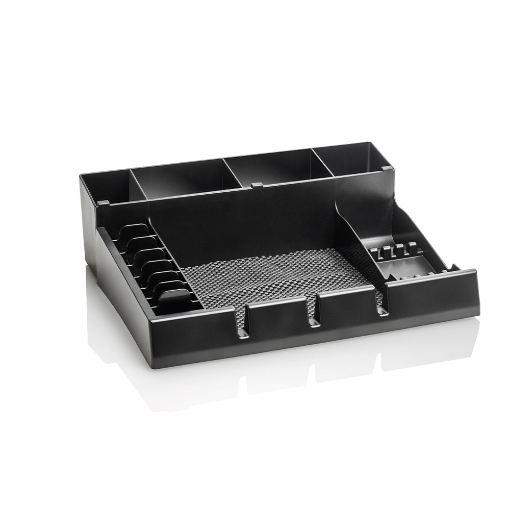 A hajvágógép- és tartozéktartó különböző tárhelyet kínál az eszközök rendben tartásához, rendezett megjelenésű munkaállomást és pultot teremtve. A hajnyírógépek számára alkalmas, csúszásmentes, üreges, könnyű alátét megakadályozza, hogy az eszközök elmozduljanak vagy elcsússzanak.