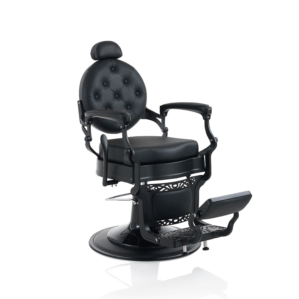 A Hair Custom Dark Devil elegáns és nagyszerű barber szék, dönthető és állítható háttámlával, kárpitozott lábtartóval és állítható fejtámlával, fekete műbőr borítással. Fekete színével és fekete krómozott keretével tekintélyt parancsoló, királyi hangulatot idéz a barber szalonodba.