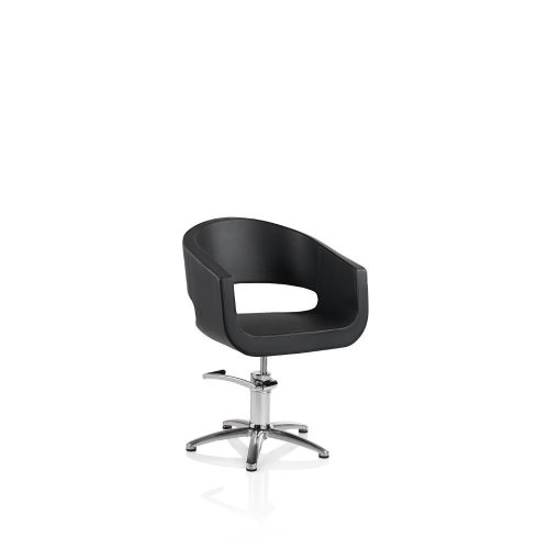 Elegáns és modern, könnyen tisztítható, fekete ökob-bőrrel kárpitozott fodrász szék, krómozott forgó talppal, hidraulikus pumpával és fékkel.