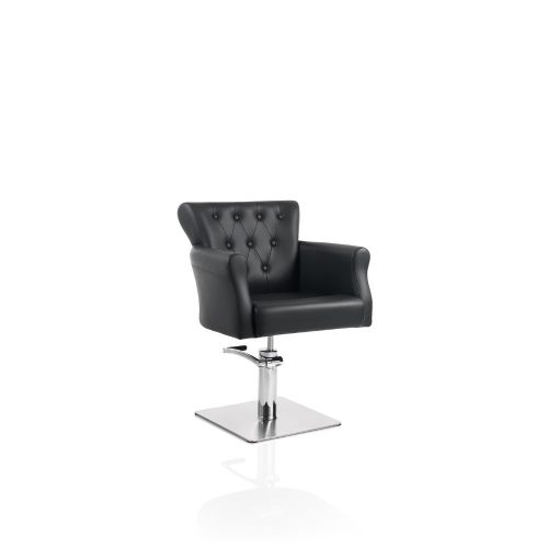 Elegáns és modern, könnyen tisztítható, fekete ökobőrrel kárpitozott fodrász szék, krómozott forgó talppal, hidraulikus pumpával és fékkel.
