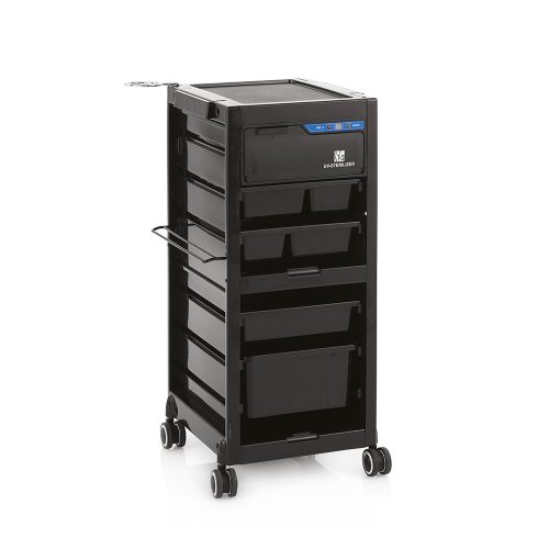 New York Pro Black fekete fiókos eszközkocsi beépített UV eszközfertőtlenítő rekesszel, amely a fodrász szalonban végzett munka alapvető többfunkciós segédeszköze. Megfelel a kényelem és az elegáns megjelenés kívánalmainak. Strapabíró anyagból, nagyméretű, praktikus fiókokkal az eszközök tárolására. Hajszárító tartóval felszerelt, igény szerint mozgatható. A beépített rekesz UVC lámpái 10 perc alatt fertőtlenítik a belehelyezett eszközeidet. Munkaeszköz a szépségápolás és a haj szakértőinek, a legújabb belsőépítészeti trendekhez igazítva.
