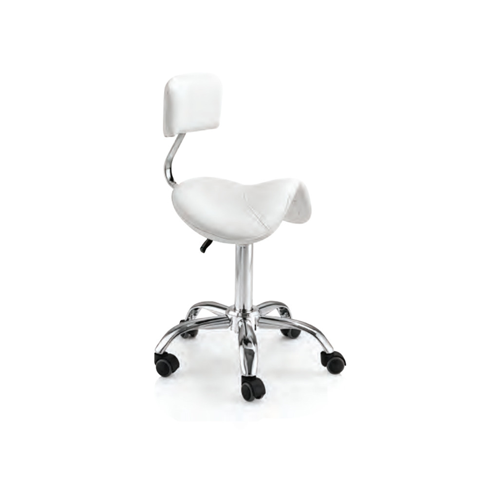 Nyerges gurulós forgózsámoly háttámlával fehér műbőr kárpittal, csillag talppal. Ez a forgózsámoly tökéletesen kiegészíti a szalon berendezését, vágáskor is használható, vagy csak a recepciós pultnál ülve; a szék kiválóan segíti a professzionális munkát a fodrászszalonokban és a szépségközpontokban egyaránt. A kényelem érdekében extra poliuretán párnázattal, műbőrrel kárpitozott a könnyű tisztítás érdekében.
