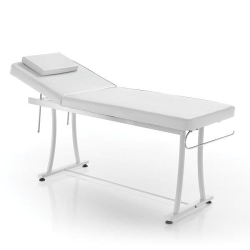 Orion masszázságy, fehér műbőr kárpittal egyszerű, letisztult dizájnnal. Ez a masszív acél szekezetű masszázságy állítható háttámlával és papír ágytakaró tartóval rendelkezik.