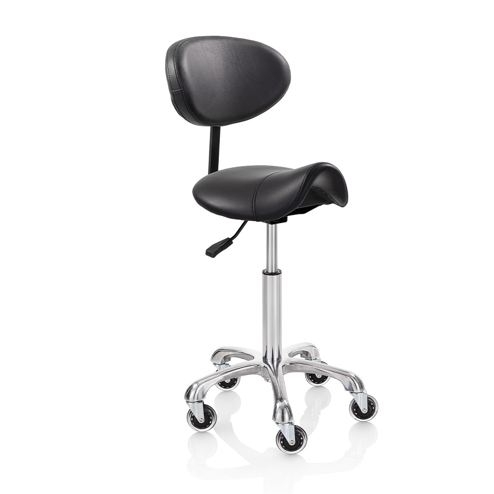 Roller Pro Elité M háttámlás nyeregzsámolyzsámoly fekete műbőr kárpittal, króm csillag talppal. Ez a forgózsámoly tökéletesen kiegészíti a szalon berendezését, vágáskor is használható, vagy csak a recepciós pultnál ülve; a szék kiválóan segíti a professzionális munkát a fodrászszalonokban és a szépségközpontokban egyaránt. Elegáns, ergonomikus és tartós – ideális választás forgalmas szalonokba.