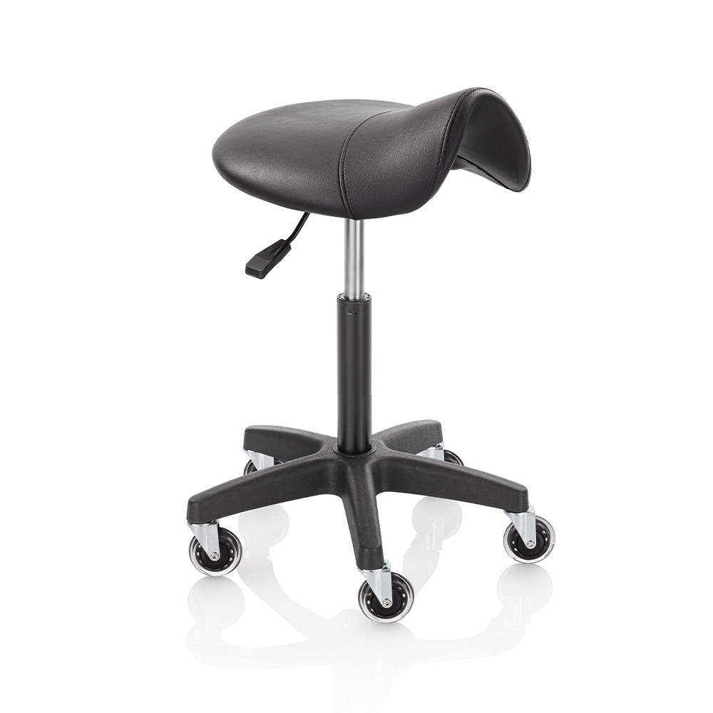Roller Pro Ideal Comfort M nyeregzsámolyzsámoly fekete műbőr kárpittal, fekete csillag talppal. Ez a forgózsámoly tökéletesen kiegészíti a szalon berendezését, vágáskor is használható, vagy csak a recepciós pultnál ülve; a szék kiválóan segíti a professzionális munkát a fodrászszalonokban és a szépségközpontokban egyaránt. Elegáns, ergonomikus és tartós – ideális választás forgalmas szalonokba.