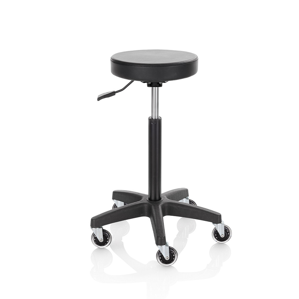 Roller Pro Ideal Round L forgózsámoly fekete műbőr kárpittal, fekete csillag talppal. Ez a forgózsámoly tökéletesen kiegészíti a szalon berendezését, vágáskor is használható, vagy csak a recepciós pultnál ülve; a szék kiválóan segíti a professzionális munkát a fodrászszalonokban és a szépségközpontokban egyaránt. Elegáns, ergonomikus és tartós – ideális választás forgalmas szalonokba.