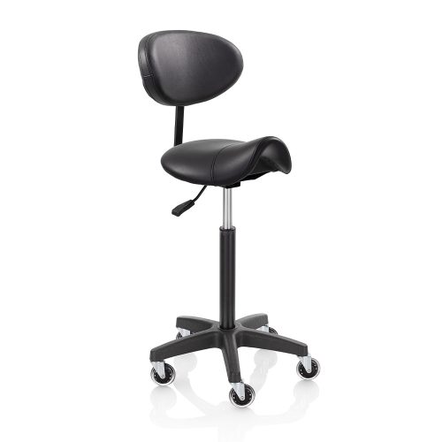 Roller Pro L háttámlás nyeregzsámolyzsámoly fekete műbőr kárpittal, fekete csillag talppal. Ez a forgózsámoly tökéletesen kiegészíti a szalon berendezését, vágáskor is használható, vagy csak a recepciós pultnál ülve; a szék kiválóan segíti a professzionális munkát a fodrászszalonokban és a szépségközpontokban egyaránt. Elegáns, ergonomikus és tartós – ideális választás forgalmas szalonokba.
