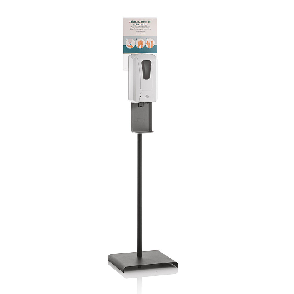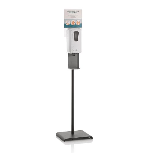 A fertőtlenítőszer kijuttatása közben a kézfertőtlenítő állomás UVC fényt is kibocsájt, ezzel is elősegítve a maximális kézfertőtlenítést. Hálózatról vagy elemről is működtethető. Az elemeket a csomag nem tartalmazza. Hálózati adapterrel együtt szállítjuk. A Sani Sensor Stand kézfertőtlenítő állomás masszív alumínium lábbal készül. Az adagoló tetején testre szabható reklámfelület áll rendelkezésre. 1200 ml fertőtlenítő folyadékot fogad be a termék.