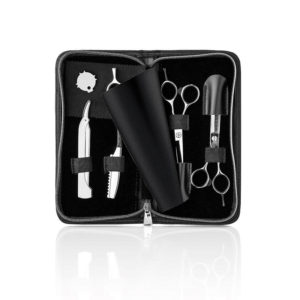 A készlet kétféle, ollót tartalmaz. Az egyik egy professzionális sima pengéjű fodrászolló. A másik egy ritkítóolló, amely fogazott pengével rendelkezik és a haj árnyalására vagy ritkítására szolgál.