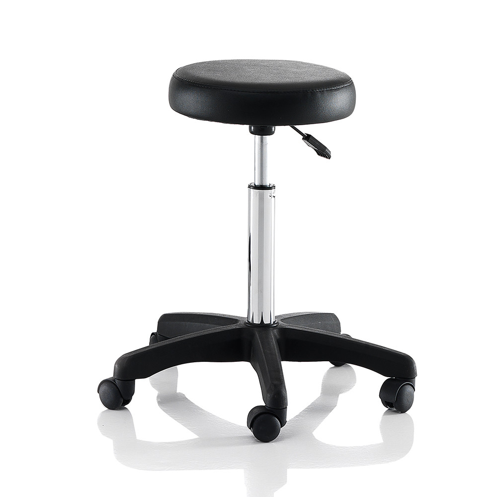 Basic gurulós forgózsámoly fekete műbőr kárpittal, csillag talppal. Ez a forgózsámoly tökéletesen kiegészíti a szalon berendezését, vágáskor is használható, vagy csak a recepciós pultnál ülve; a szék kiválóan segíti a professzionális munkát a fodrászszalonokban és a szépségközpontokban egyaránt. A kényelem érdekében extra poliuretán párnázattal, műbőrrel kárpitozott a könnyű tisztítás érdekében.