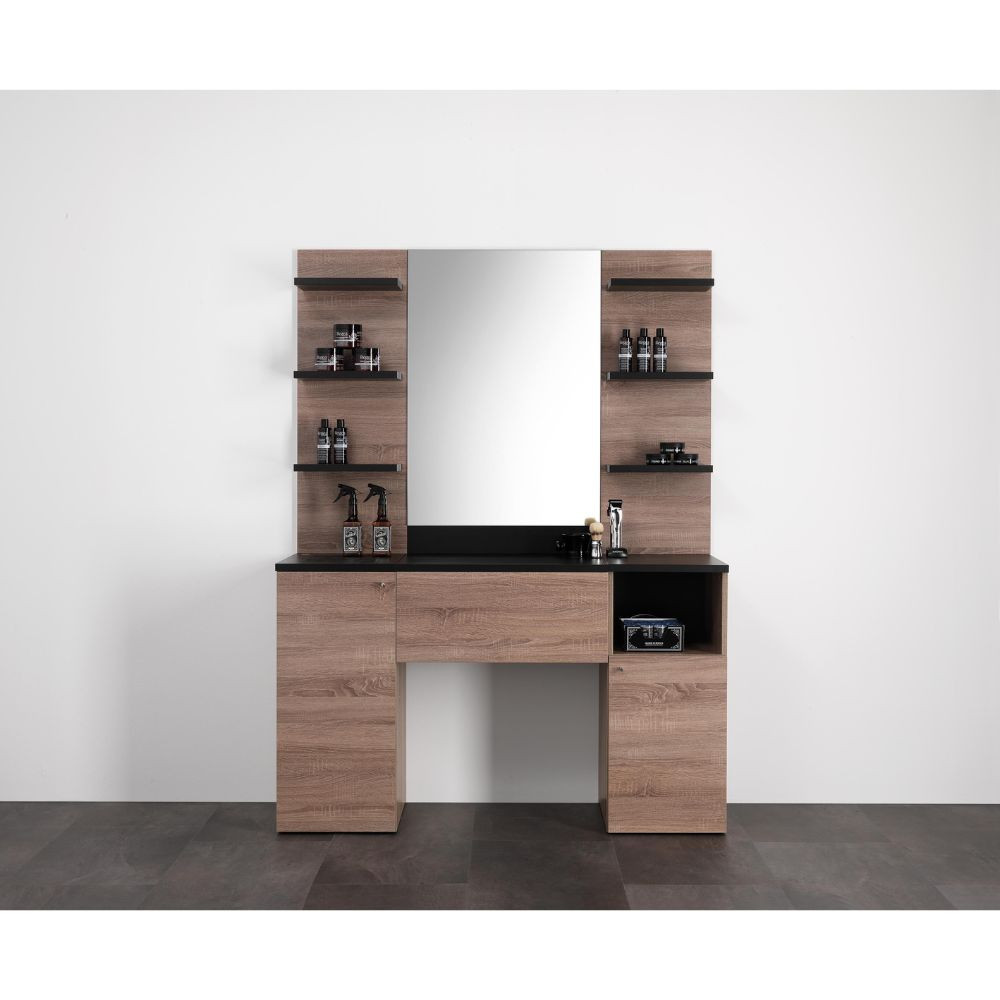 Standard Barber munkaállomás laminált tölgy faszerkezettel és polcokkal. A tükörrel és polcokkal válik teljes egésszé. Egyszerű és stílusos.
