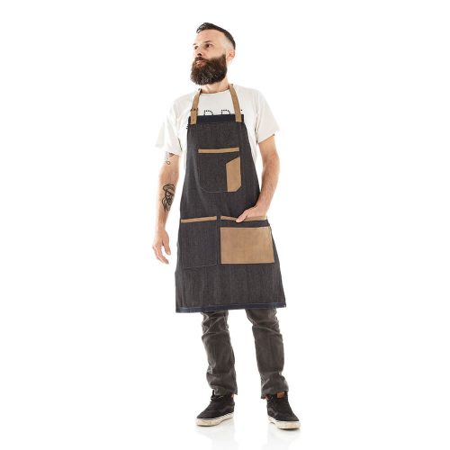 TOM Barber kötény sötét színben, farmer szövetből műbőr betétekkel. Praktikus eszköztartó zsebekkel és állítható pántokkal rendelkezik.
